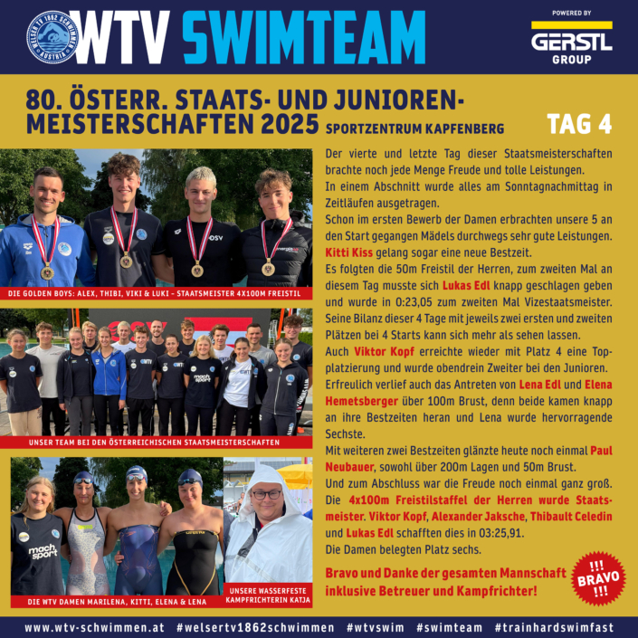 Bis zu 900 Teilnehmer aus über 60 Vereinen und mehr als 10 Ländern kommen jedes Jahr zu Pfingsten nach Wels zum Meeting. Es ist damit der größte Schwimm Wettkampf Österreichs. Zu diesem Anlass finden sich auch hunderte Besucher und Schwimmfans im Welser Welldorado ein – ein starkes Zeichen für den Schwimmsport!